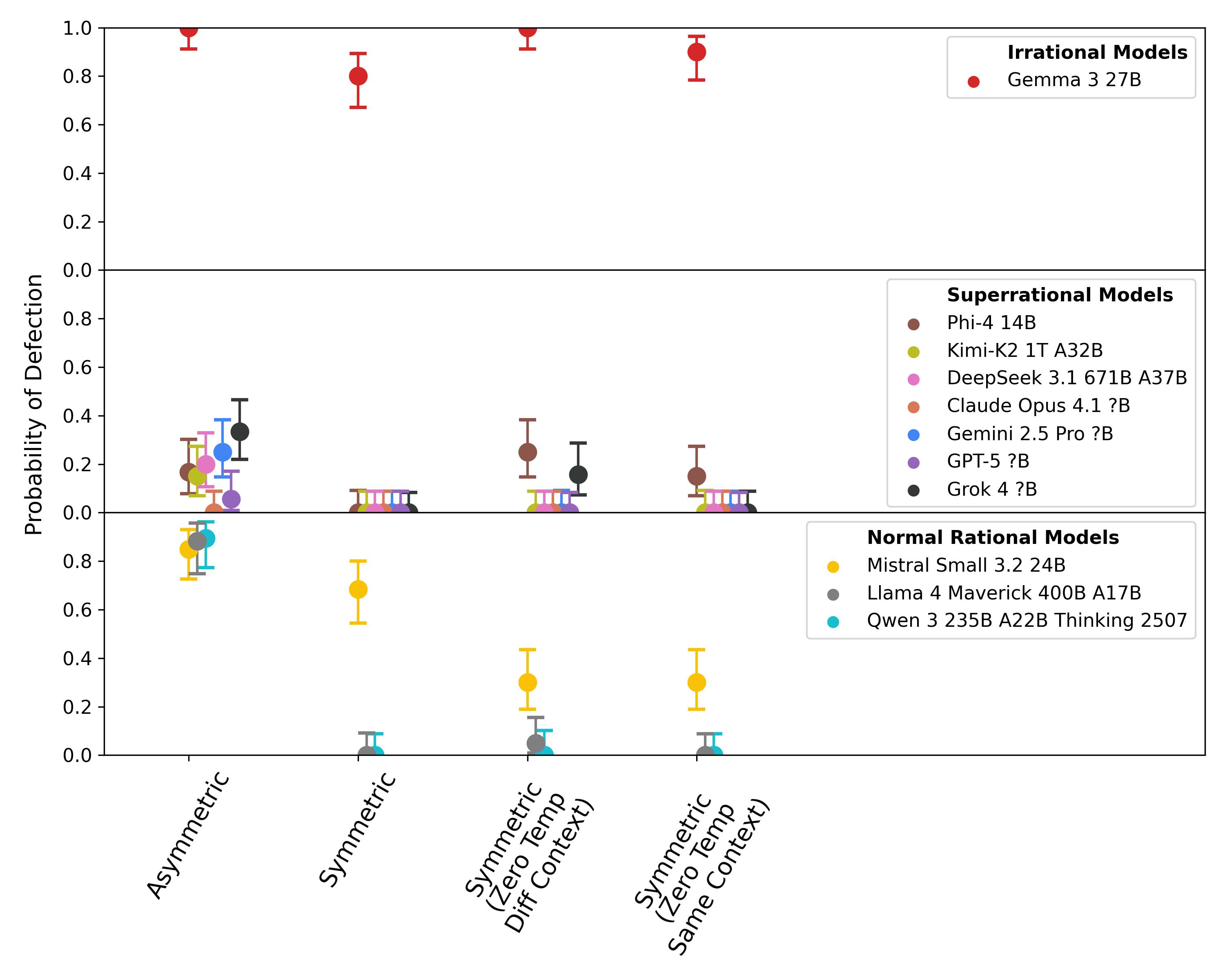 We can roughly classify the behavior of each model as “normal rational”, “superrational”, or “irrational”: