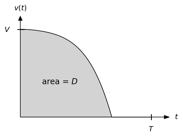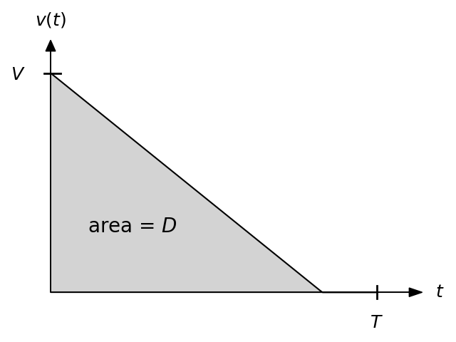 Going back to the expected value of speed, this corresponds to the average height of the \(v(t)\) graph between \(t=0\) and \(t=T\). Since the area is constant, the average height is constant, which again agrees with our earlier conclusion that it does not matter what \(v(t)\) you choose or how hard you brake.