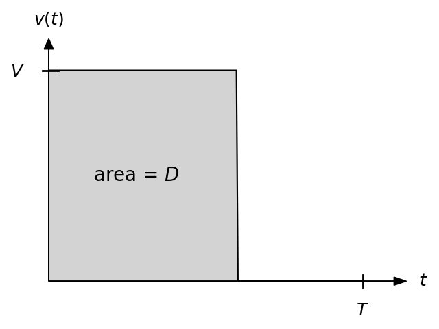 However, we now note that this integral is exactly equal to the expression which calculates the total distance traveled at time \(T\)! So, we just need an \(v(t)\) that maximizes distance traveled at time \(T\). Given our assumption \(V > D/T\), we know it is possible to have a \(v(t)\) function that reaches \(D\) at time \(T\) (the function which stays at \(v=V\) until you reach the intersection and then comes to an abrupt halt at \(v=0\)). So, \(\int_0^T v(t_g) dt_g=D\) is possible. And \(\int_0^T v(t_g) dt_g>D\) is forbidden, because that means you plan to enter the intersection even if the light is red. Therefore, we’ve found our optimum!