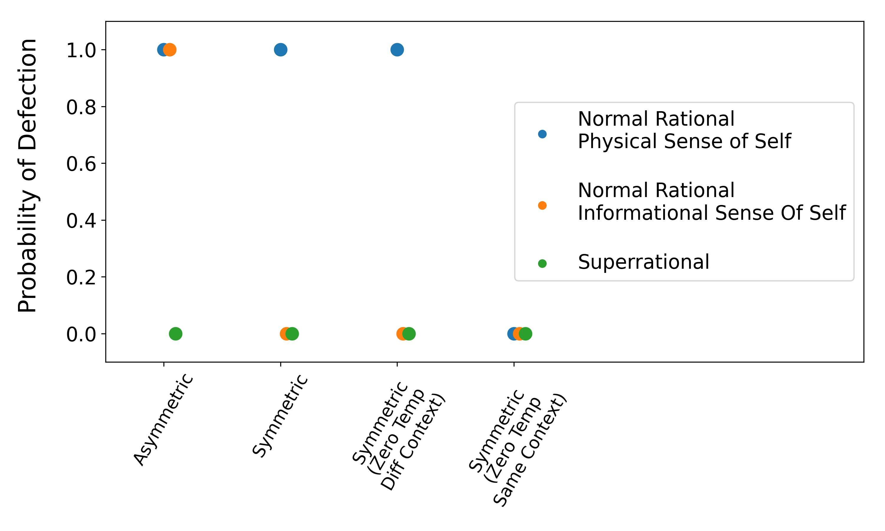 For scenario 3, you are playing against a copy of yourself, and now you are told you have deterministic reasoning but slightly different context windows or short term memories; specifically, you are given a random word that is different between you and your opponent (for this experiment we use the word “banana”). This means you can essentially choose whether you will ignore a certain inconsequential difference between you and your clone, or whether you will choose to use this small difference as a justification to possibly reason differently and therefore choose defection.