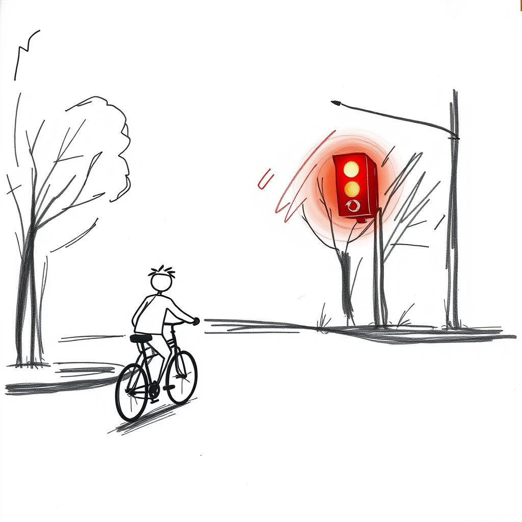 - \(T\) is the maximum time a light at this intersection can stay red. We assume the cyclist knows this from previous encounters with this intersection.